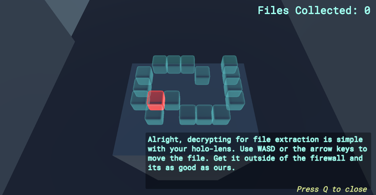 As a special agent, you've been sent into a complex to extract four files from the location. Use you hacker skills and holo-lens to decrypt files and pick locks in this short prototype game.